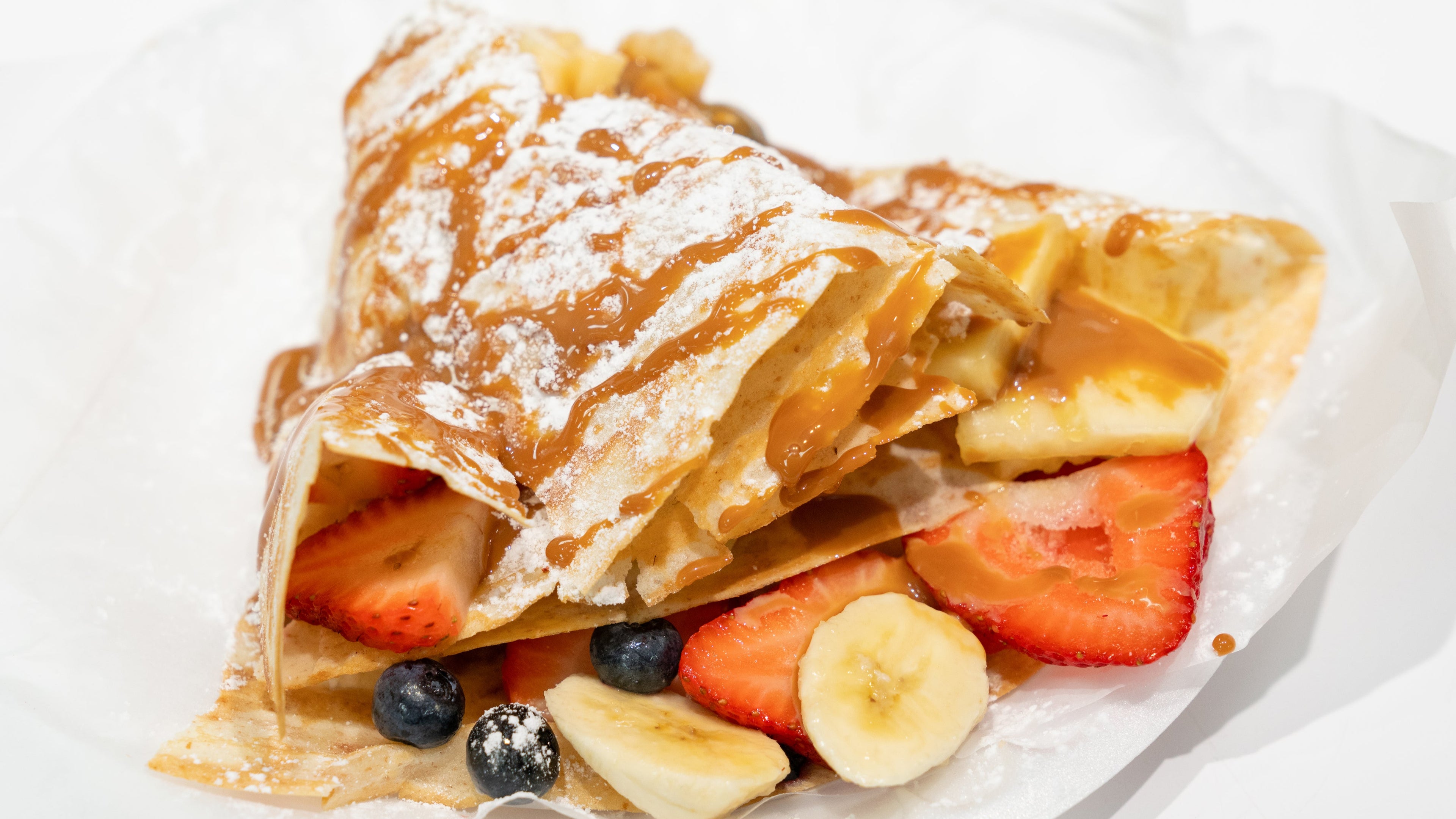 Fresh bananas, juicy berries, wrapped in a soft crepe and drizzled with chocolate
