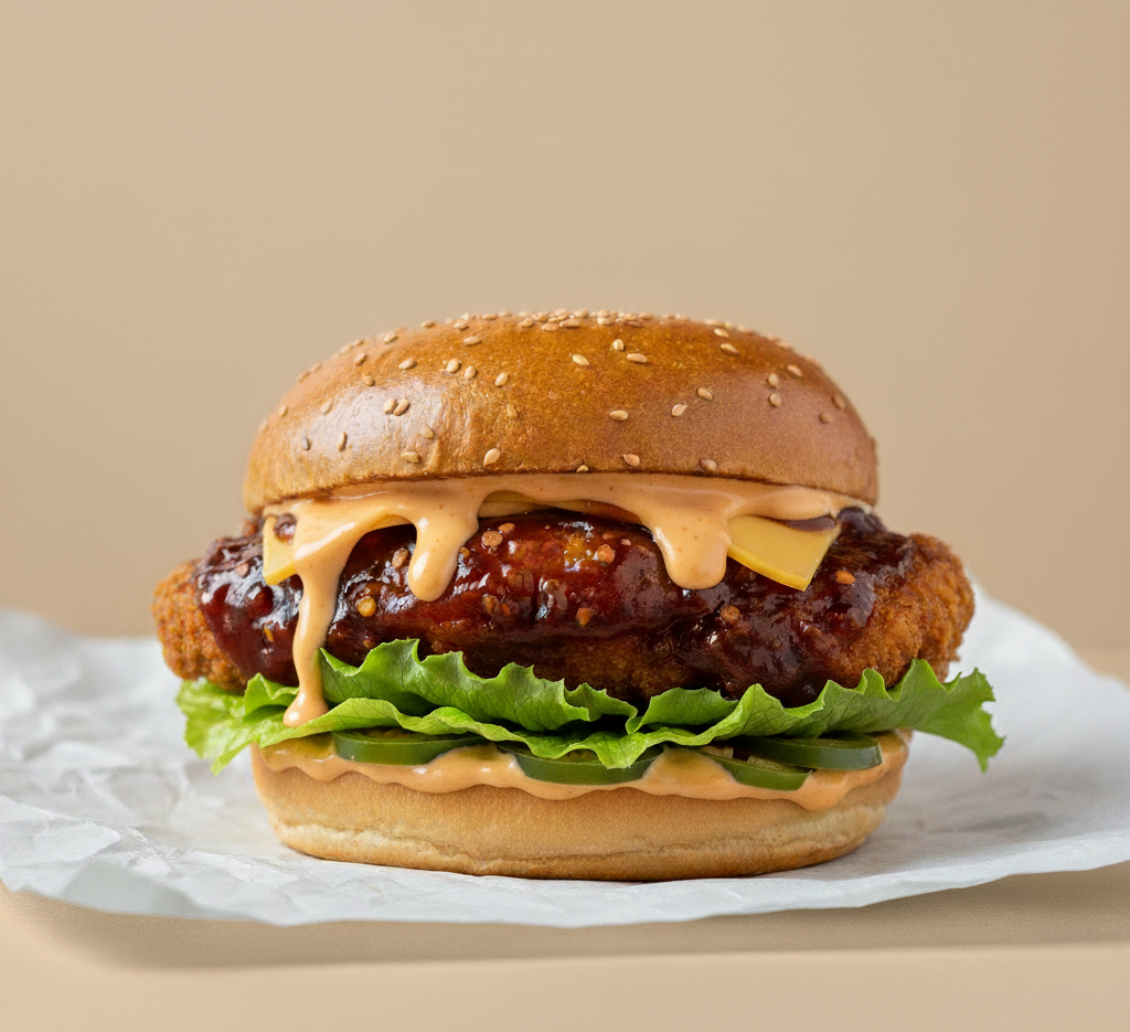Smoky-sweet BBQ chicken with a bold chili kick, layered with fresh jalapeños, our signature hot mayo, and a drizzle of secret “Dragon BBQ” sauce, all tucked into a toasted seeded brioche bun for a slow-burning heat.